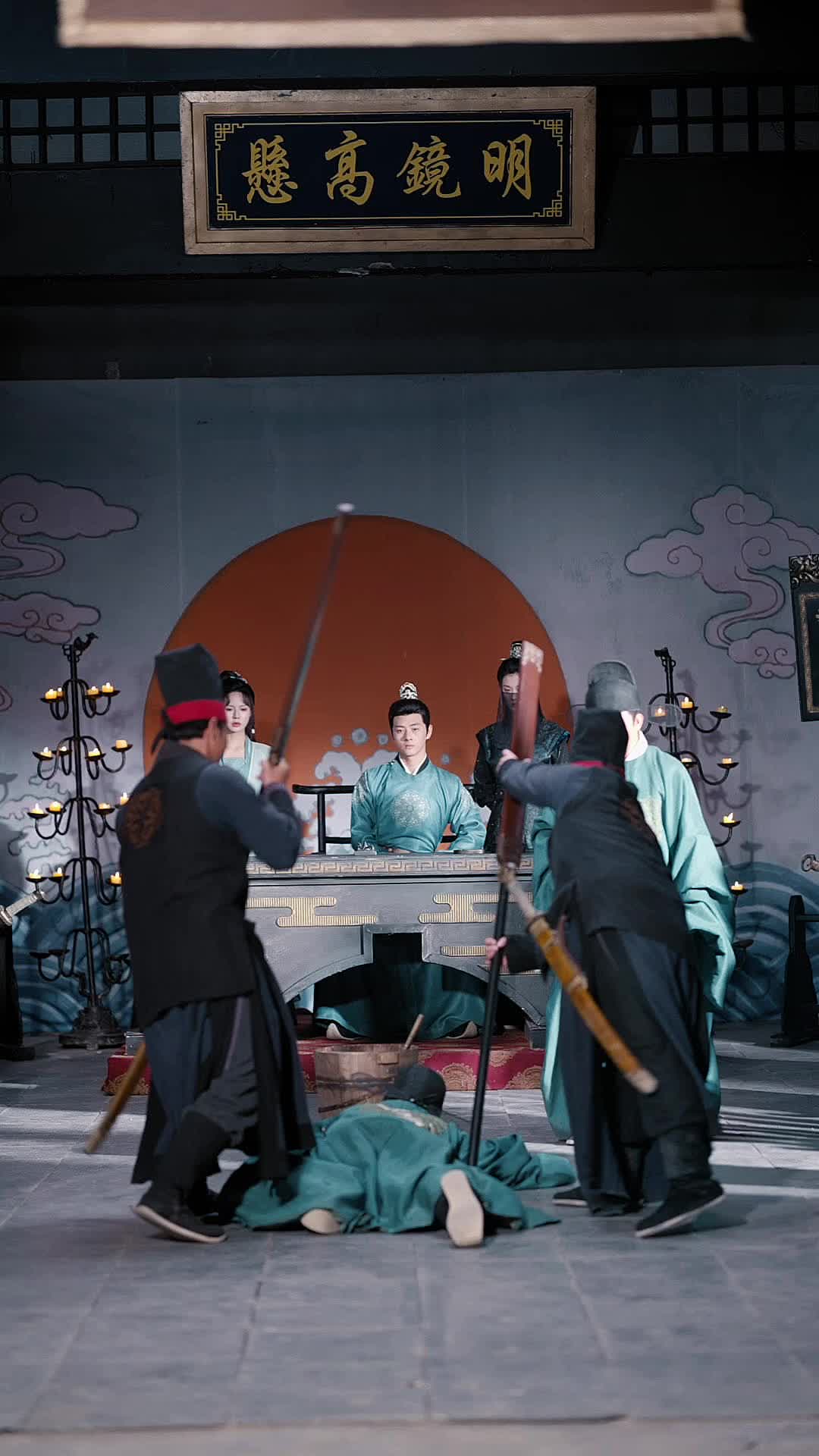 定风波 Épisodes 28, 大梁朝称量黄河水,预见今年风调雨顺,皇上大喜。刘保坤送上三口大锅作为贺礼,声称里头是用两脚羊做的三道江南名菜“和骨烂”、“饶把火”、“不羡羊”。谁料锅中竟是三个面黄肌瘦的老百姓,哭诉江南民不聊生。皇上大怒,赐刘保坤尚方宝剑,要他以一月为期前往江南彻查贪腐。